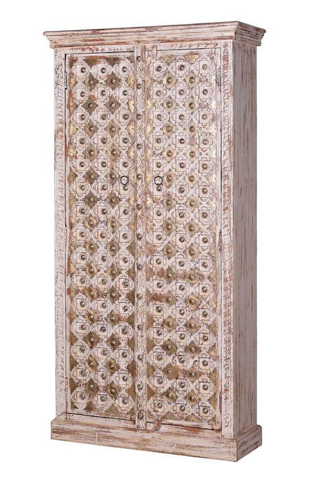 Este armario de 2 puertas está fabricado artesanalmente en madera maciza de mango, con elegantes tallas e incrustaciones en los frentes de las puertas que se completan con botones de bronce para lograr una estética de antigüedad clásica y sofisticada. El diseño incluye prácticos estantes interiores para una óptima organización.