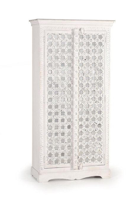 Armario fabricado en madera de mango con una elegante talla geométrica que incorpora incrustaciones de cristales en sus huecos. Este mueble de estilo artesanal cuenta con 2 puertas y 3 estantes interiores, presentándose en un acabado color blanco.