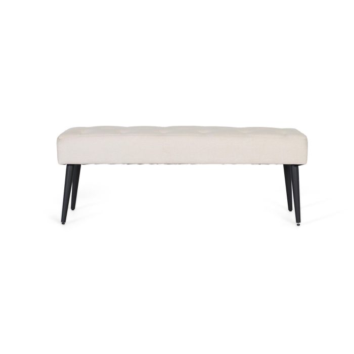 Banca elegante y funcional con estructura de cuatro patas cónicas de hierro en acabado negro, que ofrecen estabilidad y resistencia. El asiento está tapizado en tela beige, un tono neutro y versátil que aporta luminosidad y calidez visual. El acolchado generoso y la técnica de capitoné con botones forrados crean un efecto de relieve geométrico, aportando un detalle clásico y sofisticado al diseño. GROSOR ASIENTO: 14 cm | ALTURA PATAS: 28 cm.