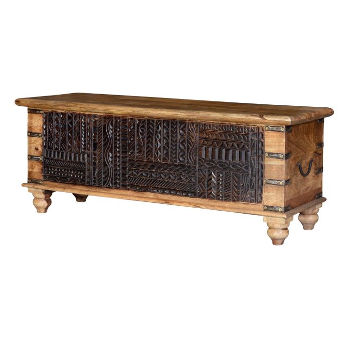 Baúl fabricado en madera de mango, con apertura superior y gran capacidad de almacenaje. Diseño con frontal tallado a mano, destacando las características únicas de la madera natural. Al tratarse de un mueble artesanal, puede presentar nudos, vetas y variaciones de color propias de la materia prima, lo que aporta autenticidad y singularidad a cada pieza.