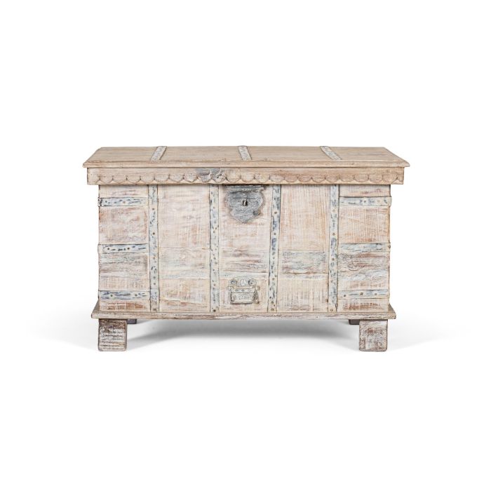 Baúl de madera maciza con acabado blanco decapado y apertura superior. Ideal para almacenamiento y decoración en ambientes con estilo vintage o colonial. Fabricado en madera de mango, presenta refuerzos metálicos decorativos y una cerradura ornamental en el frontal que añade carácter rústico y atractivo visual. Su diseño envejecido resalta la autenticidad del producto. Medidas interiores: 40 x 76 x 37 cm. Altura de patas: 9 cm. Espesor de la tapa: 9 cm.