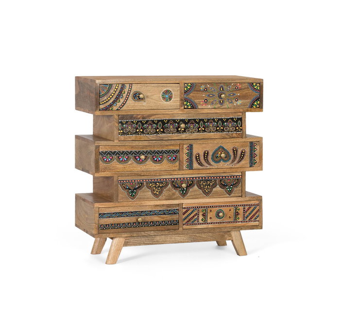Cajonera de madera maciza de mango con 8 cajones, cada uno con frontales decorados con detalles pintados a mano que presentan diseños únicos y artesanales. Estos motivos variados añaden un toque artístico y cultural, convirtiendo la pieza en arte funcional ideal para embellecer cualquier habitación.