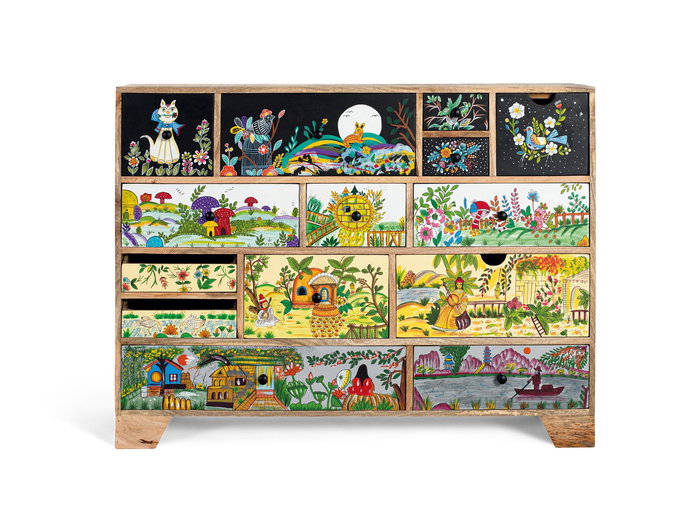 Cómoda fabricada en madera de mango con un marcado estilo étnico y artesanal. Presenta cajones de distintos tamaños, cada uno pintado a mano con escenas llenas de color y detalle. Entre sus decoraciones destacan animales, paisajes naturales, flores, casas tradicionales y figuras fantásticas, creando un conjunto alegre y narrativo. Además de su utilidad como mueble de almacenaje, es una pieza decorativa única que llena el espacio de encanto bohemio y un aire exótico. Características técnicas: Alto: 90 cm. Largo: 120 cm. Ancho: 40 cm. Material: Madera de mango. Color: Multicolor. Peso: 58 kg. Medida de la caja: 96 x 127 x 47 cm. No requiere montaje. Marca: GINER Y COLOMER. Cuidado: Limpiar con un paño seco. Número de bultos: 1.
