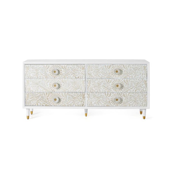 COMODA 6 CAJONES GINER Y COLOMER – Mueble artesanal fabricado en madera de mango con talla manual en los frentes de las puertas. Acabado blanco raspado que resalta la textura natural del material. Ideal para aportar un toque de estilo rústico y elegante a tu hogar. Medidas: 80 cm alto x 170 cm ancho x 40 cm fondo. Volumen: 0,54 m³. Peso: 70 kg. Al tratarse de madera natural y pieza artesanal, puede presentar nudos, vetas y diferencias sutiles en el color, lo que aporta singularidad única a cada unidad.