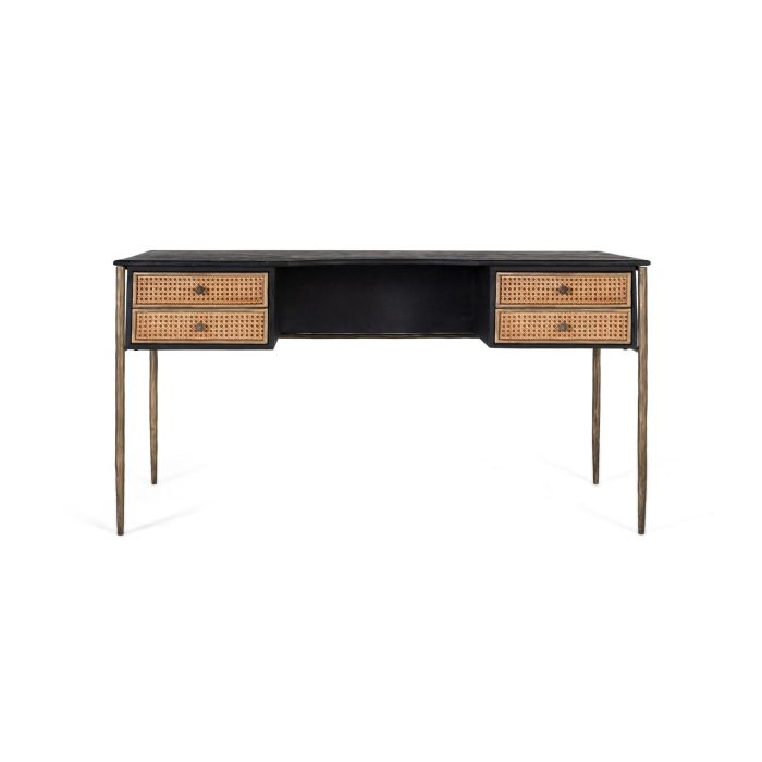 Escritorio GINER Y COLOMER con diseño elegante y funcional, elaborado en madera de mango con acabado en color negro. Su estructura ligera visualmente se sostiene mediante patas delgadas de hierro en tono bronce, combinando estilo y resistencia. Cuenta con cuatro cajones —dos a cada lado— cuyos frentes están fabricados en rejilla natural para una estética moderna y práctica organización. El tablero presenta un sutil recorte curvo en el centro, optimizando la ergonomía y la comodidad al usuario durante el uso. Ideal para espacios de trabajo o estudio, este escritorio combina diseño contemporáneo con funcionalidad.