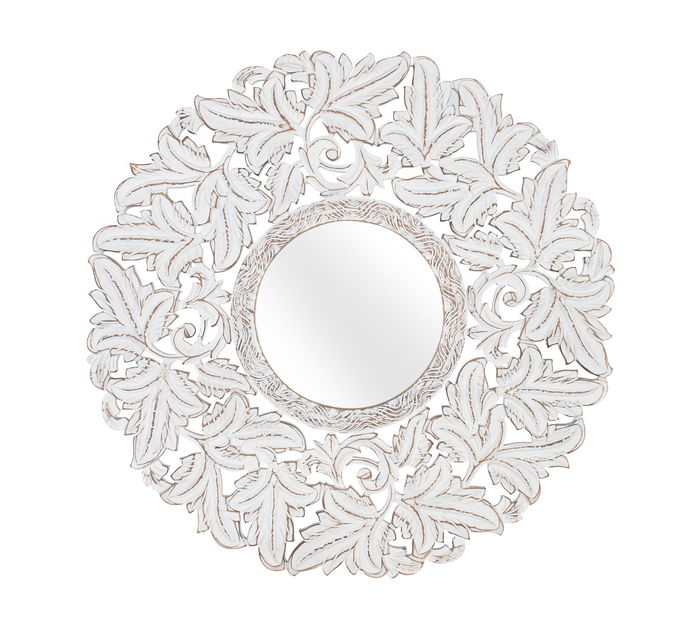 GINER Y COLOMER Espejo Redondo Decorativo Tallado a Mano, MDF, Acabado Pátina Blanca, Diámetro 120 cm