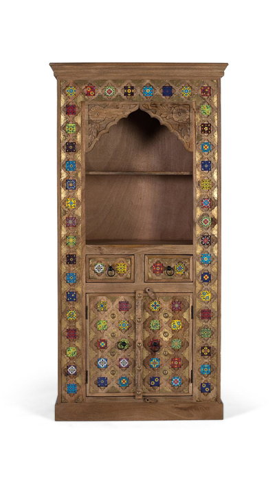 Librería de estilo étnico fabricada en madera de mango por Giner y Colomer. Terminada en un elegante color avellana. Una moldura en la parte superior enmarca la estructura, el marco frontal, los dos cajones y las puertas están adornados con pequeñas baldosas de cerámica pintadas a mano en una vibrante variedad de colores, generando un atractivo juego de profundidad y textura. Un zócalo firme aporta estabilidad al diseño y remata con equilibrio esta pieza que fusiona funcionalidad con un estilo étnico.