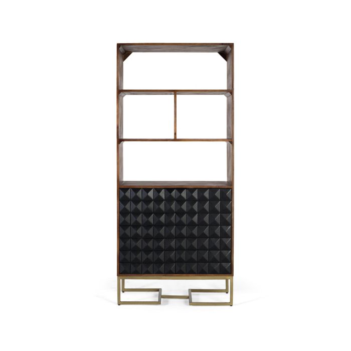 Librería elegante fabricada en madera de mango, un material robusto y duradero que destaca por sus vetas naturales. Su estructura presenta un acabado en color avellana, combinado con detalles en negro mate para un contraste sofisticado. Cuenta con tres baldas abiertas ideales para organizar libros o objetos decorativos. En la parte inferior, dos puertas con diseño geométrico en forma de punta de diamante que aportan un efecto tridimensional y profundidad visual. Cada puerta incluye una balda interior de 77x35 cm, también en negro mate. La base está realizada en hierro con perfil cuadrado, pintada en color dorado para un toque de elegancia y brillo metálico. Medidas: puertas 59x38 cm, altura de patas 21 cm, tapa de 1.6 mm.