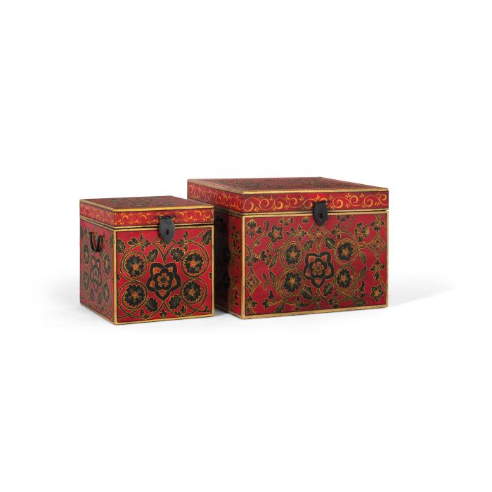 Set de dos baúles de madera de mango con diseño artesanal inspirado en el arte tradicional indio. Cada pieza cuenta con una estructura sólida y funcional, ideal para almacenamiento. El exterior está pintado a mano en tonos rojos con delicados motivos florales dorados y negros, aportando un toque étnico y vibrante a cualquier espacio. Incluyen cierres metálicos frontales en negro envejecido, realzando su estilo decorativo y resistencia. Perfectos para combinar prácticos con un diseño único.