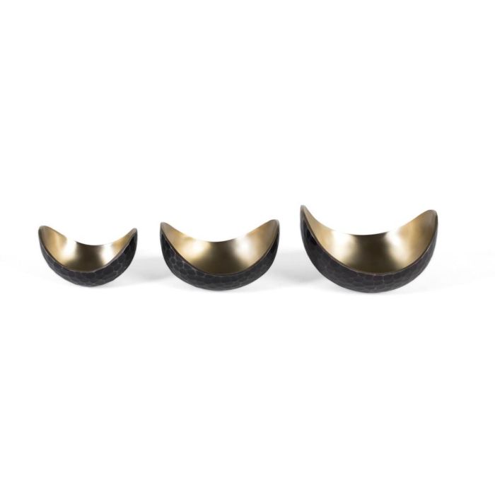 Juego de tres cuencos decorativos de GINER Y COLOMER, fabricados en aluminio con un diseño moderno y contemporáneo. La parte interior presenta un acabado dorado brillante que aporta lujo y elegancia, mientras que el exterior cuenta con un color negro mate con un efecto martillado artesanal que aporta textura y sofisticación. Cada cuenco tiene un tamaño diferente, permitiendo utilizarlos de forma individual o en conjunto para crear composiciones decorativas únicas. Ideal para decorar mesas, estanterías o como elemento de centro de mesa, este juego combina funcionalidad y estilo. Perfecto para espacios de diseño, interiores modernos o como regalo especial.
