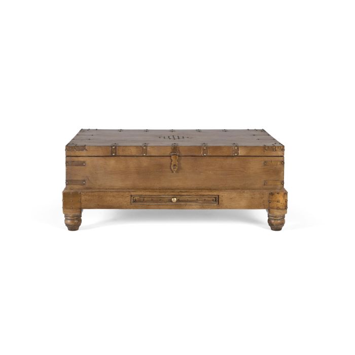 Mesa de centro tipo baúl fabricada en madera maciza de mango, con diseño rústico e industrial que combina calidez natural con un toque moderno. Incorpora una tapa superior abatible que accede a un amplio espacio de almacenamiento interior (15 x 99 x 63 cm), ideal para organizar objetos sin perder estética. El mueble incluye un cajón frontal con tiradores de hierro, y refuerzos metálicos en esquinas y bordes para mayor durabilidad. Sus patas torneadas aportan un aire clásico y elegante al conjunto. Perfecta para salones o zonas de estar donde se combina funcionalidad y estilo.