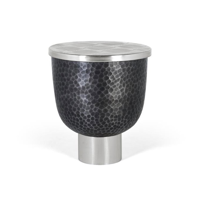 Descubre la mesa de centro redonda Giner y Colomer, una pieza que fusiona el diseño moderno con la artesanía tradicional. Su tapa de aluminio presenta grabados que crean un patrón orgánico y elegante, mientras que la base de metal con acabado en color negro y diseño martillado aporta una textura de carácter rústico. La interacción entre los grabados de la tapa y la base genera un contraste armonioso, perfecto para ambientes contemporáneos.