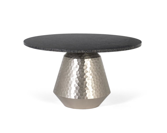La base, fabricada en aluminio, presenta una forma cónica que le otorga estabilidad y un diseño imponente. Su superficie ha sido martilleada a mano, generando una textura irregular que realza su aspecto artesanal y añade un atractivo juego de luces y sombras.