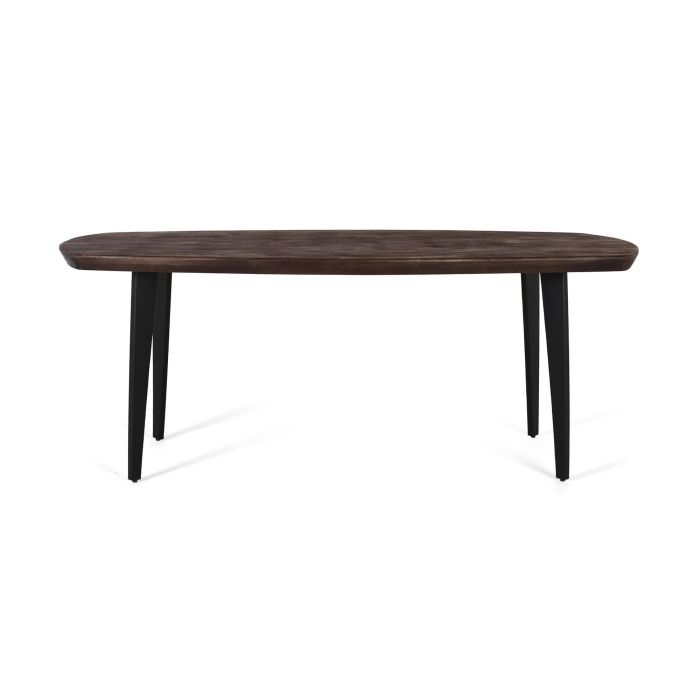 Esta elegante mesa de comedor combina diseño contemporáneo con un acabado sofisticado. Su tapa, con forma suavemente ovalada, está fabricada en madera de mango con acabado color nogal oscuro y textura de chorro de arena para un toque de autenticidad y calidez. Las patas, realizadas en hierro robusto, presentan un diseño estilizado y ligeramente cónicas, lacadas en negro mate para un contraste moderno y duradero. Su estructura sencilla pero firme refuerza el estilo minimalista-industrial, ideal para espacios con personalidad. Perfecta para reuniones familiares o momentos de conexión, esta mesa destaca por su funcionalidad y elegancia atemporal.