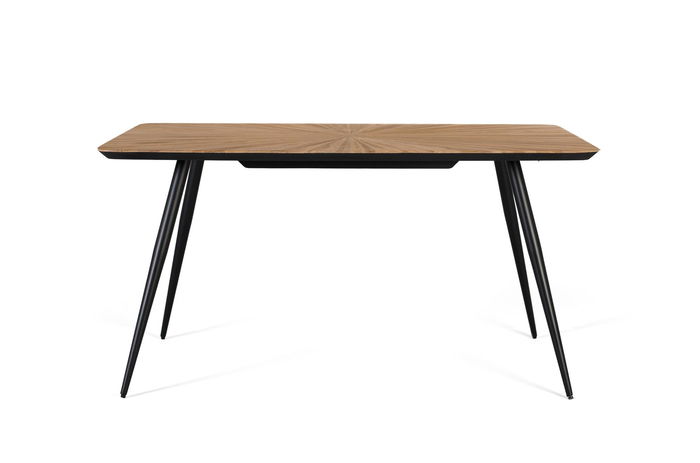 Descubre la mesa de comedor que combina elegancia, funcionalidad y sostenibilidad. Fabricada por GINER Y COLOMER con un cuidado excepcional, esta pieza está construida en madera de teca reciclada y cuenta con patas de hierro pintadas en negro. Su sobre rectangular presenta un diseño artesanal con un espectacular patrón radial que emana desde el centro, resaltando las vetas naturales y las variaciones tonales propias de la teca. Las esquinas redondeadas del tablero aportan una sensación de ligereza visual y seguridad, mientras que las patas metálicas, de líneas delgadas y ligeramente inclinadas, proporcionan una base sólida y estable.