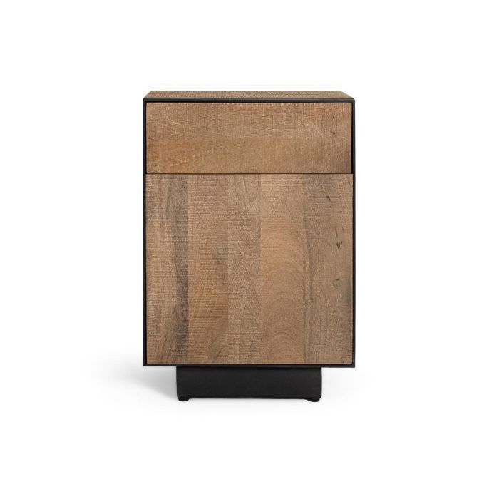 Mesilla de noche GINER Y COLOMER fabricada en madera de mango con acabado en tono natural. Diseño que combina funcionalidad y estética, con un cajón superior y una puerta inferior con apertura push que accede a una balda interior. La estructura está enmarcada por un marco metálico exterior que aporta un aire moderno e industrial, mientras que la base de hierro garantiza solidez y estabilidad. Versátil y con una calidez natural, ideal para dormitorios de estilo contemporáneo o industrial.