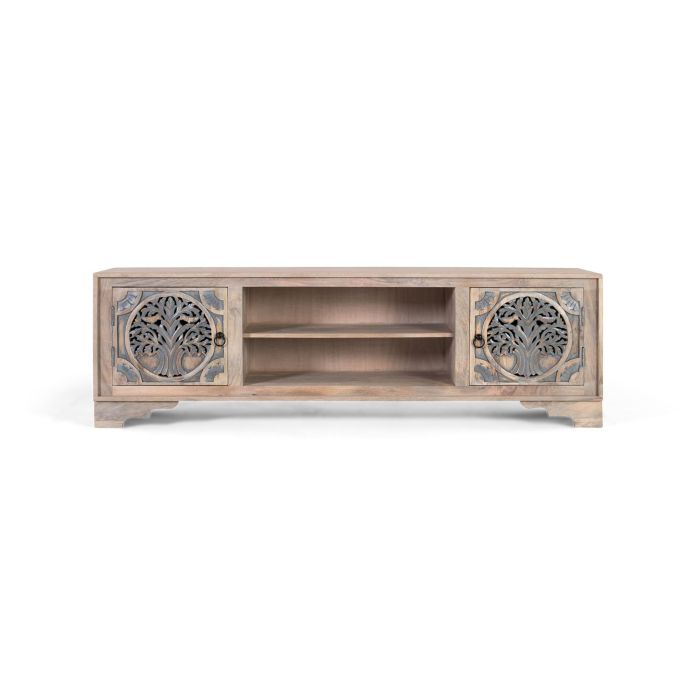 Mueble de TV elaborado en madera de mango con acabado en tono natural que resalta su textura y color orgánico. Diseño equilibrado con una puerta en cada costado y un hueco central abierto. Las puertas están finamente talladas con una figura del árbol de la vida, mientras los tiradores metálicos en forma de anilla aportan un toque rústico. Un repisa remata la base del mueble, otorgándole un acabado elegante y cuidadosamente detallado. Ideal para combinar funcionalidad con estilo natural.