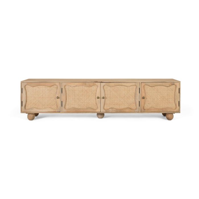 Mueble de TV GINER Y COLOMER en madera de mango con acabado natural, resaltando sus vetas únicas y aportando un toque cálido y acogedor a tu salón. Diseño alargado con 4 puertas y frontis de rejilla trenzada, ideal para organizar dispositivos, accesorios y objetos del hogar. Incluye estantes interiores no regulables (H 18 cm × L 96 cm × F 35 cm). Contornos ondulados en las puertas y patas redondas de madera refuerzan el estilo artesanal, combinando ligereza visual con robustez. Cierres magnéticos y bisagras tipo piano garantizan durabilidad y seguridad en el uso.