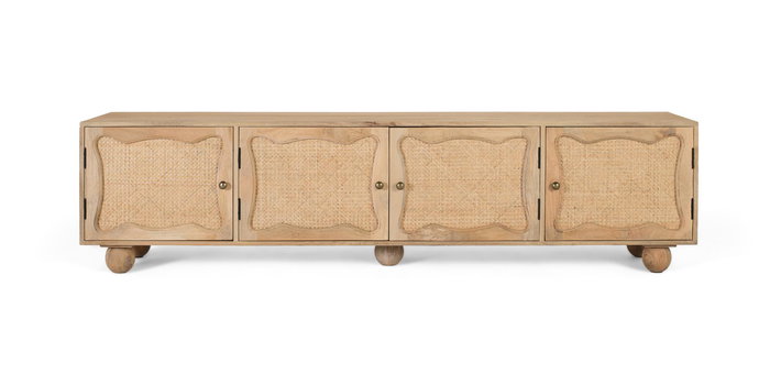Este elegante mueble de TV está fabricado en madera de mango con acabado natural, que resalta las vetas del material y aporta un carácter cálido y acogedor a cualquier salón. Su diseño alargado incorpora cuatro puertas con frontis de rejilla trenzada y baldas interiores, ofreciendo amplio espacio para organizar dispositivos, accesorios y otros elementos del hogar.