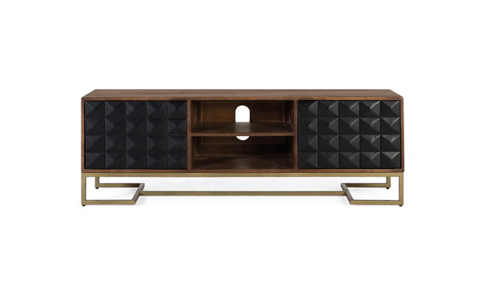 Este elegante mueble para TV de GINER Y COLOMER combina la calidez de la madera con un diseño contemporáneo. Fabricado en madera de mango con un acabado en color avellana que resalta las vetas naturales. Cuenta con dos baldas abiertas en la parte central, ideales para colocar dispositivos electrónicos. A los costados, presenta dos puertas pintadas en color negro mate, revestidas con un diseño de figuras geométricas en forma de punta de diamante que crea un efecto tridimensional, añadiendo textura y un toque distintivo. La base está elaborada en hierro de perfil cuadrado, pintada en un elegante color dorado que aporta estabilidad y un sutil brillo metálico.