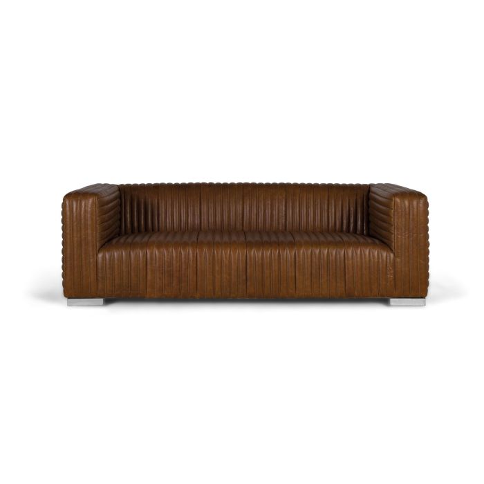 Sofá de 3 plazas de la marca GINER Y COLOMER, diseñado con un estilo moderno y robusto. Tapizado en piel 100%, ofrece un tacto suave y una gran durabilidad. Su acabado presenta un elegante patrón acolchado con costuras verticales, mientras que su estructura cúbica y envolvente proporciona comodidad y firmeza. Las patas de acero inoxidable añaden estabilidad, resistencia y un contraste sofisticado con la calidez del cuero. Ideal para espacios interiores, este sofá destaca por su calidad y diseño contemporáneo.