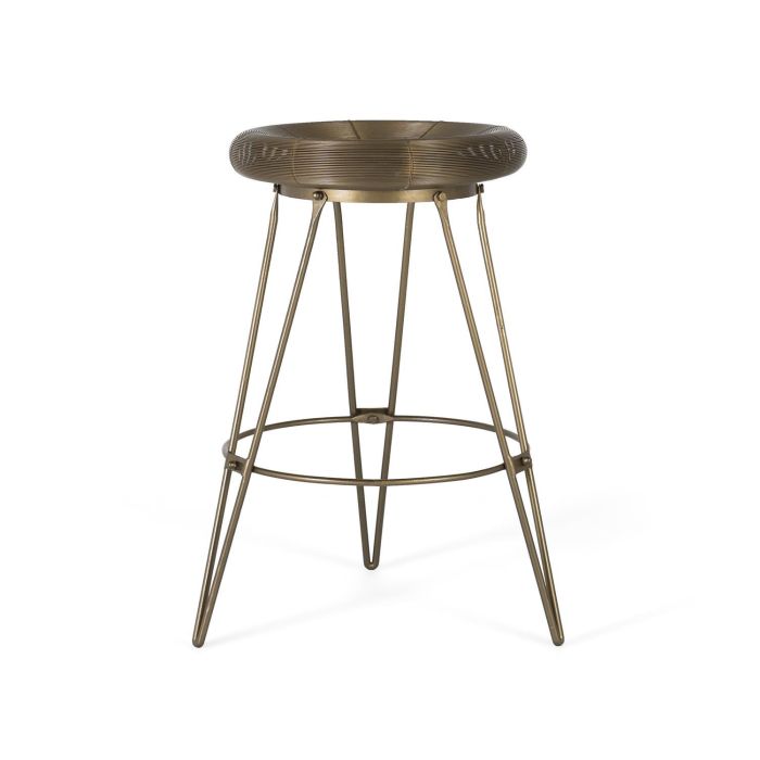 Taburete de bar metálico de GINER Y COLOMER. Diseño industrial y contemporáneo, fabricado en metal para garantizar durabilidad y resistencia. Su color dorado aporta un toque elegante y moderno a cualquier ambiente. Ideal para espacios de diseño, comedores o zonas de trabajo. Al tratarse de una pieza en metal, puede presentar variaciones en el tono y textura propias del material, destacando su carácter único. Requiere montaje. Cuidado: limpiar con un paño seco.