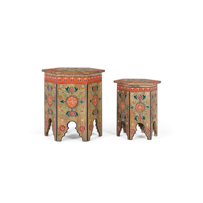 Dos taburetes únicos, elaborados a mano en madera de mango, con una estructura robusta y un diseño artesanal distintivo de forma hexagonal. Sus laterales presentan bordes redondeados en la parte inferior para un acabado suave y seguro. Cada pieza está cuidadosamente pintada a mano con una paleta vibrante de colores vivos y alegres, destacando motivos florales y formas geométricas que transforman cada taburete en una obra de arte funcional. Combina la calidez natural de la madera con un toque bohemio auténtico, ideal para espacios decorados con estilo cálido y original.