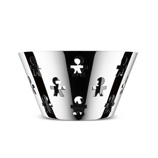 Este cesto redondo perforado con forma de muñeco está fabricado en acero y diseñado por King-Kong es ideal para servir el pan en su mesa con un toque moderno y divertido. El dúo King-Kong, formado por Stefano Giovannoni y Guido Venturini, ha diseñado una decoración alegre para objetos de uso diario. El motivo de los hombrecillos que se unen en un corro alegre da su nombre a una rica colección de objetos para el hogar y la oficina, como el frutero Girotondo realizado en acero inoxidable calado.