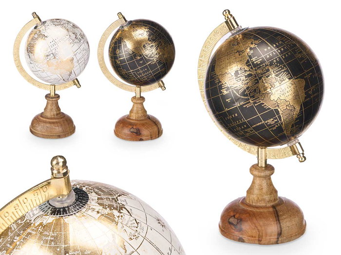 Giftdecor Globo Terraqueo 12,5 cm Blanco, Negro y Oro con Base de Madera y Metal (Set de 12)