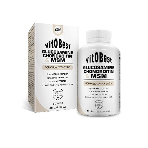 sulfato de glucosamina, sulfato de condroitina (pescado), Metil-Sulfonil-Metano (MSM) (OptiMSM®), espesante (cápsula): gelatina, antiaglomerante: estearato de magnesio y colecalciferol (vitamina D).