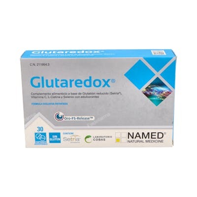 Indicaciones: Glutaredox es un innovador complemento alimenticio que contiene una alta dosis de glutatión reducido (Setria®), selenio, vitamina C y L-cistina cuya administración se realiza mediante una innovadora tecnología de liberación diferenciada Oro-FastSlow-Release (Oro-FS-ReleaseTM) que garantiza la máxima absorción de glutatión reducido, el mayor antioxidante y detoxificante del cuerpo. El selenio y la vitamina C contribuyen a proteger a las células frente al daño oxidativo. Comprimidos orodispensables.