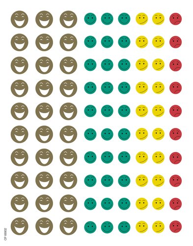 Gomets Mini cara feliz con adhesivo removible y diferentes caras, que enseñan a los niños a expresar sentimientos y estados de ánimo, al mismo tiempo que motivan y premian su esfuerzos y logros. Unos gomets con adhesivo de base al agua, libres de disolventes, fabricados con papeles ECF y materiales 100% reciclables. Cada bolsa contiene 4 estilos de cara diferentes: 60 cara dorada de Ø 15 mm, 60 cara verde de Ø 10 mm, 40 cara amarilla de Ø 10 mm y 20 cara roja de Ø 10 mm.