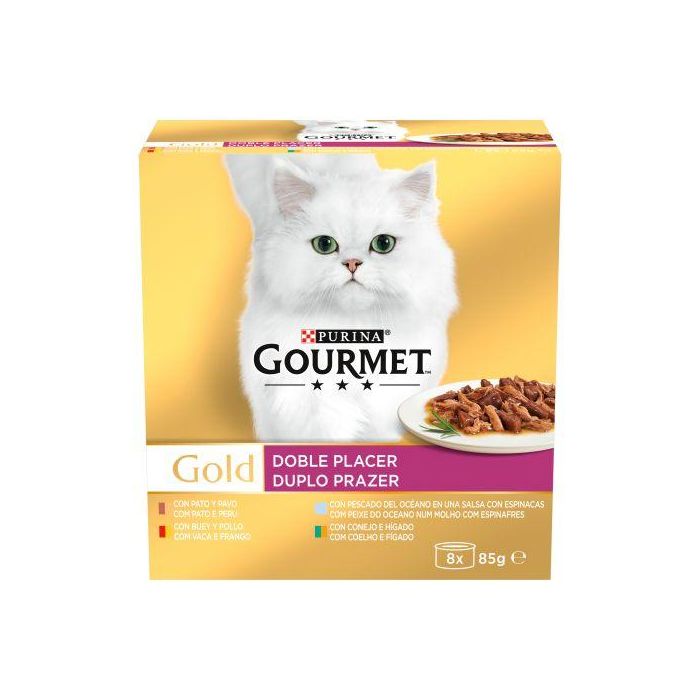 Tu gato es un verdadero experto y le gusta probar diferentes texturas y sabores cada día. Por eso GOURMET Gold ha creado Doble Placer, sabrosas recetas para mimar su sofisticado paladar con una experiencia diferente de sabor en cada comida. Tiernos trocitos combinados con láminas dulcemente cocinadas: la combinación ideal de dos texturas diferentes en la misma comida para ofrecer a tu gato el placer de una sutil mezcla de gustos y texturas.