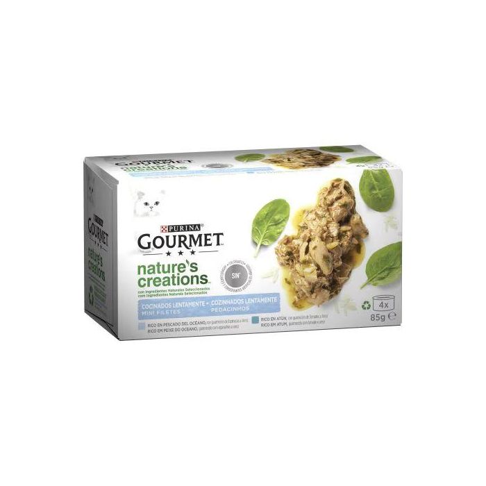 Descubre las deliciosas recetas de PURINA® GOURMET® Nature's Creations, especialmente formuladas para deleitar el paladar de tu gato. Este pack incluye 4 latas de 85g cada una, perfectas para ofrecer una alimentación completa y equilibrada.