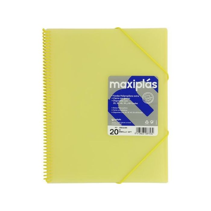 Grafoplás Maxiplás Carpeta A4 con 20 Fundas, Espiral PVC, Sobre Adhesivo, Polipropileno Translúcido Amarillo Soft