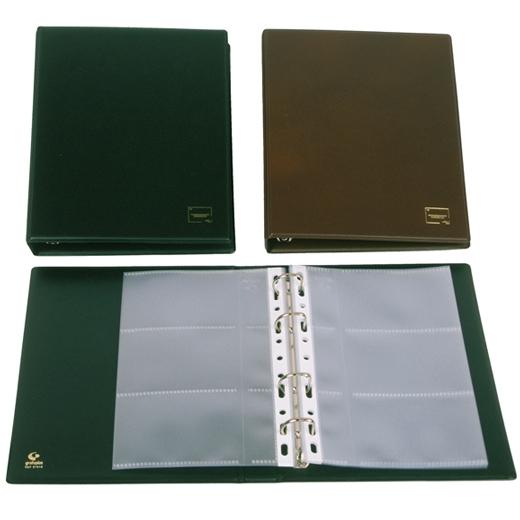 Cubiertas en PVC expandido. Mecanismo de 4 anillas mixtas de 20mm. Se suministra con 10 fundas con capacidad para 60 tarjetas de visita, formato 105x68 mm.