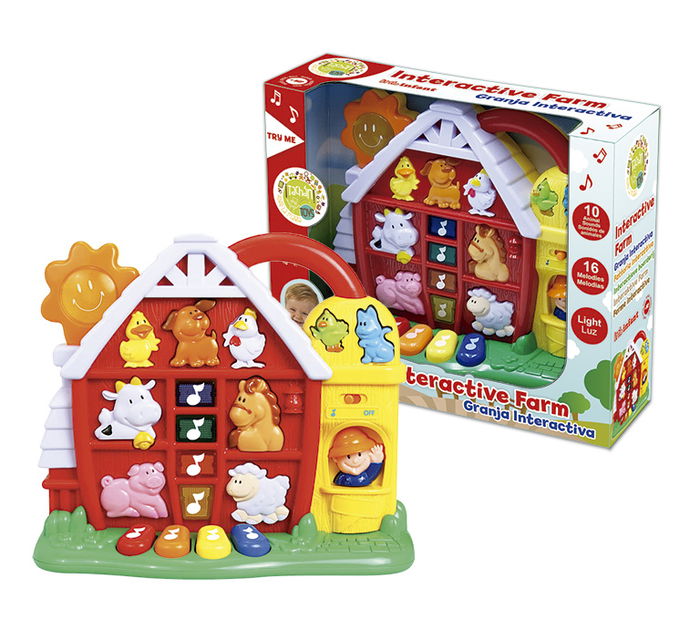 Con 9 sonidos de animales, perro, pollo, gallo, pájaro, gato, cerdito, vaca, cordero y pato y el sonido del granjero. 4 teclas para sonidos musicales. Pulsa una de las 16 melodías y al pulsar un animal este cantará con la música. Funciona con pilas, incluidas.