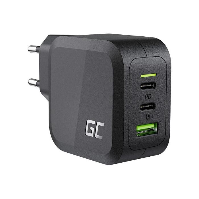 Green Cell CHARGC08 Cargador GaN 65W, Power Delivery, Quick Charge 3.0, 2 USB-C + 1 USB-A, Ultra Charge, PPS, 100-240V, Negro