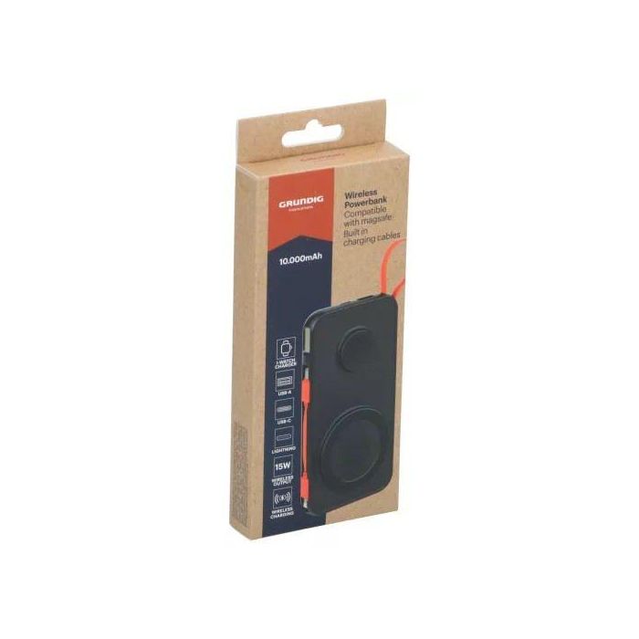 Powerbank Grundig con una capacidad de 10000 mAh, ideal para tus dispositivos. Incluye carga inalámbrica MagSafe compatible para un fácil acople con tus dispositivos Apple, así como un cargador inalámbrico específico para Apple Watch. Ofrece una potencia de carga de hasta 15W para una recarga rápida y eficiente.