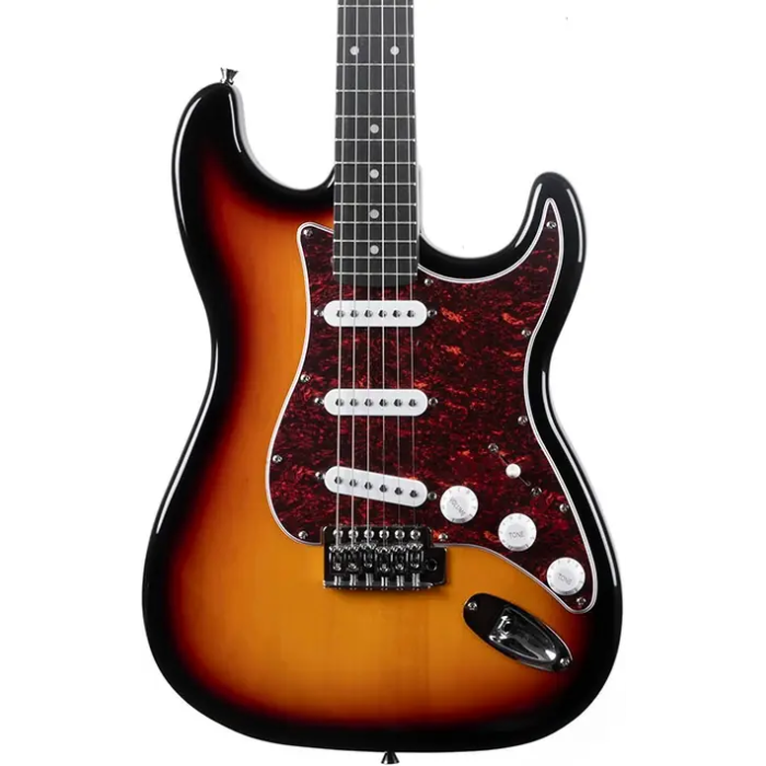 - Herrajes: Cromados- Categoría: Eléctrica de 6 cuerdas- Puente/cordal: Tipo Strat con selletas independientes- Cuerdas originales: Eko 10/46- Cuerpo: Álamo- Color: Sunburst- Diapasón (mm): 650 mm- Escotadura: Doble- Electrónica: Pasiva- Acabado: Brillante- Formato: Stratocaster- Forma del mástil: C de perfil bajo- Ancho en la cejuela: 42 mm- Mástil: Arce- Clavijas: Diecast- Pastilla central: Simple- Pastilla puente: Simple- Pastilla mástil: Simple- Número de cuerdas: 6- Número de trastes: 22- Número de pastillas: 3- Radio: 14 pulgadas- Ajustes: 2 tonos, 1 volumen- Marcadores: Punto- Selector: 5 posiciones- Varilla de ajuste: Doble sentido- Diapasón: Laurel- Vibrato: Estándar- Especificaciones adicionales:- Placa protectora: Blanca- Acabado del cuerpo: Brillante- Acabado del mástil: Satinado