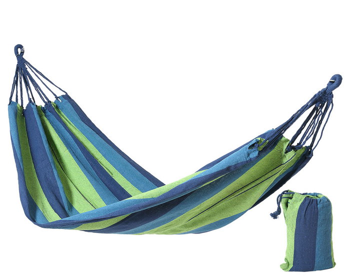 Hamaca colgante ideal para descansar en tus vacaciones o en tu tiempo libre en el jardín. gracias a su práctica bolsa de transporte podrás llevarla a todos lados e instalarla rápidamente en un lugar fresco y a la sombra.