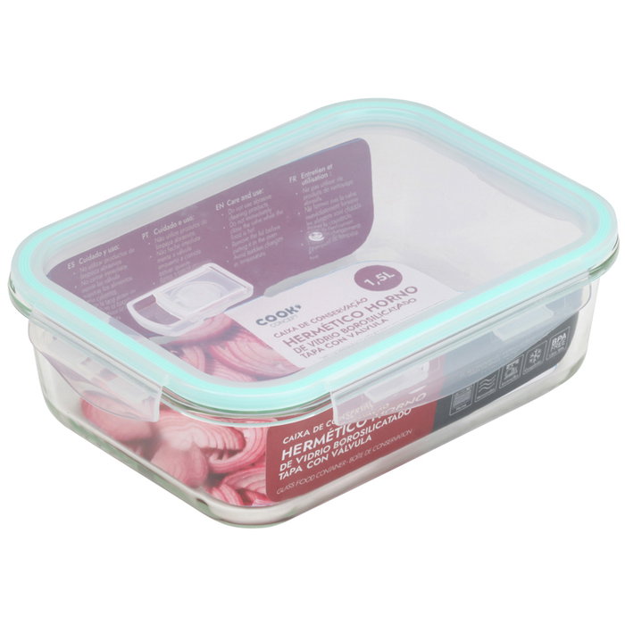 - Hermético horno de vidrio borosilicatado y tapa con válvula. Forma rectangular.