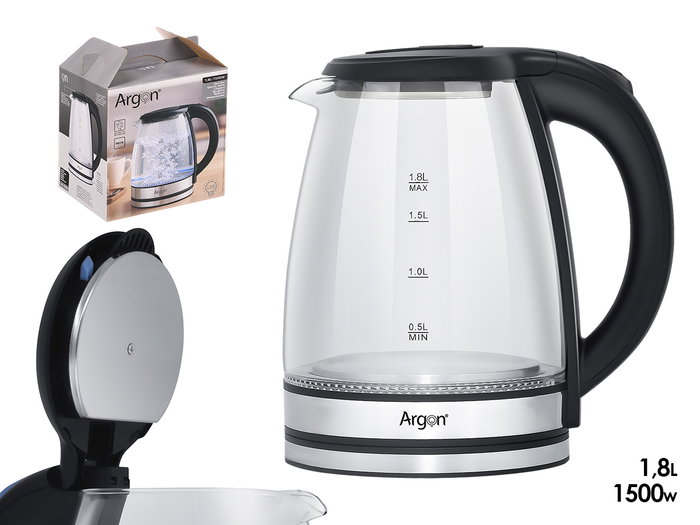 Argon Hervidor Acero Borosilicato LED 1.8 L Transparente Negro Plata 22x23.5x16cm (Set de 6)