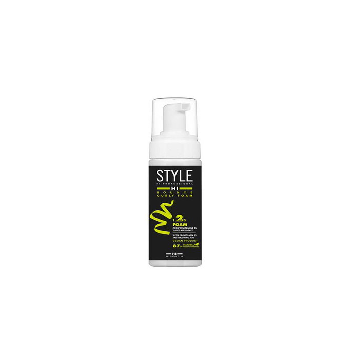 Espuma capilar de fijación fuerte de HI STYLE. Formulada a partir de compuestos naturales (85%) y principios activos como la Provitamina B5 y el Ácido Hialurónico. Producto capilar de acabado que permite modelar los cabellos rizados según el estilo deseado.