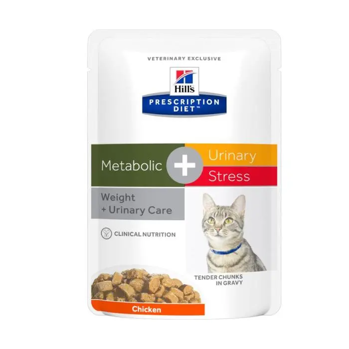 Hill's Prescription Diet c/d Multicare Stress Metabolic es una fórmula veterinaria especialmente diseñada para gatos que sufren de problemas del tracto urinario inferior (FLUTD) y que además tienen tendencia al sobrepeso o necesitan control de peso. Esta innovadora comida húmeda combina beneficios para la salud urinaria y la gestión del peso en una deliciosa presentación en pouch de 85 gramos, ideal para la alimentación diaria de tu felino.