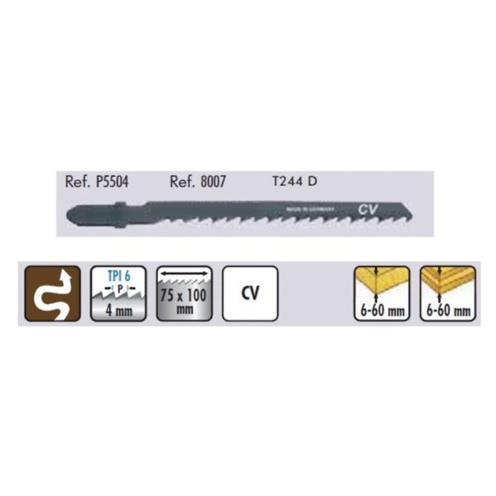 La hoja de calar para madera con corte basto curvo 5504 T244D es ideal para realizar cortes precisos y detallados en madera. Su diseño curvo permite crear formas y recortes intrincados.