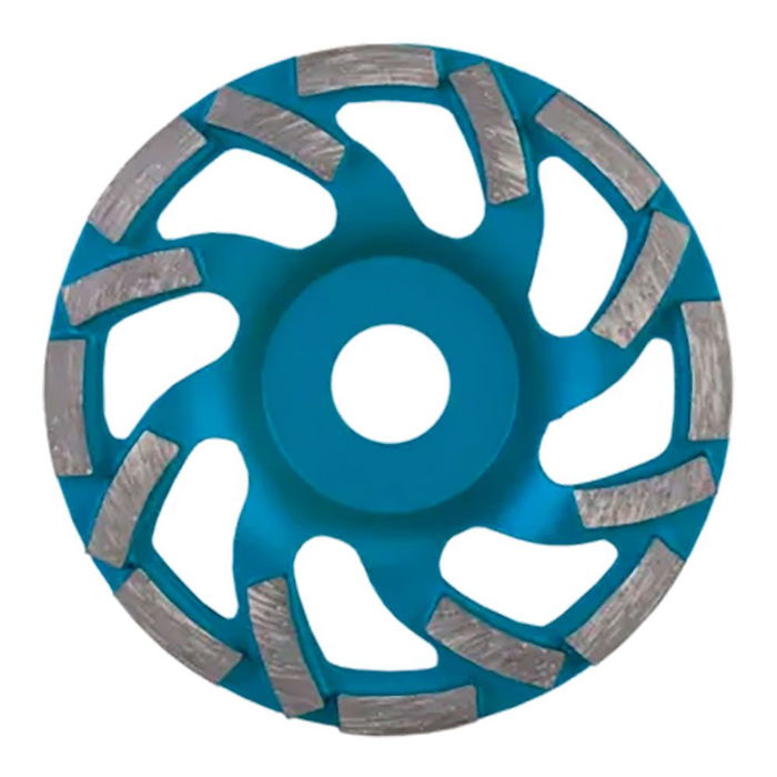 Muela desbaste fan cup para hormigón ø100 mm. los segmentos sinterizados se fijan al cuerpo de acero, de altas prestaciones, de la muela mediante la técnica de la soldadura láser, la más fuerte y resistente.el diseño específico del cuerpo de acero y la disposición perpendicular de los segmentos de diamante facilitan la evacuación de los restos de material de desbaste e incrementan la refrigeración de la muela de diamante.