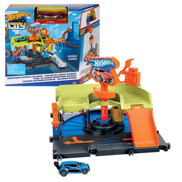 Después de luchar contra las despiadadas criaturas de Hot Wheels City, ve a la estación de lavado para librarte de la suciedad y de los escombros de la ciudad. Gira el letrero con el logotipo y el coche se moverá automáticamente por la estación de lavado, siempre visible a través de las ventanas transparentes. Sube la rampa para repostar o aparcar, y luego lánzate a buscar nuevas aventuras. El conjunto se conecta a otros conjuntos Hot Wheels mediante múltiples puntos de conexión y viene con un vehículo Hot Wheels para que la diversión y el juego de empuje empiecen nada más abrir la caja. Se venden por separado y están sujetos a disponibilidad. Los colores y la decoración pueden variar.