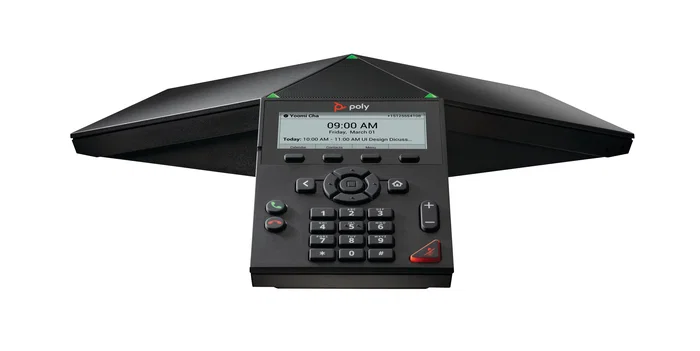 - Una sencilla interfaz inicia la reunión en cuestión de segundos. El teléfono de conferencias Poly Trio 8300 ofrece una conectividad Wi-Fi, USB, Bluetooth, e IP.