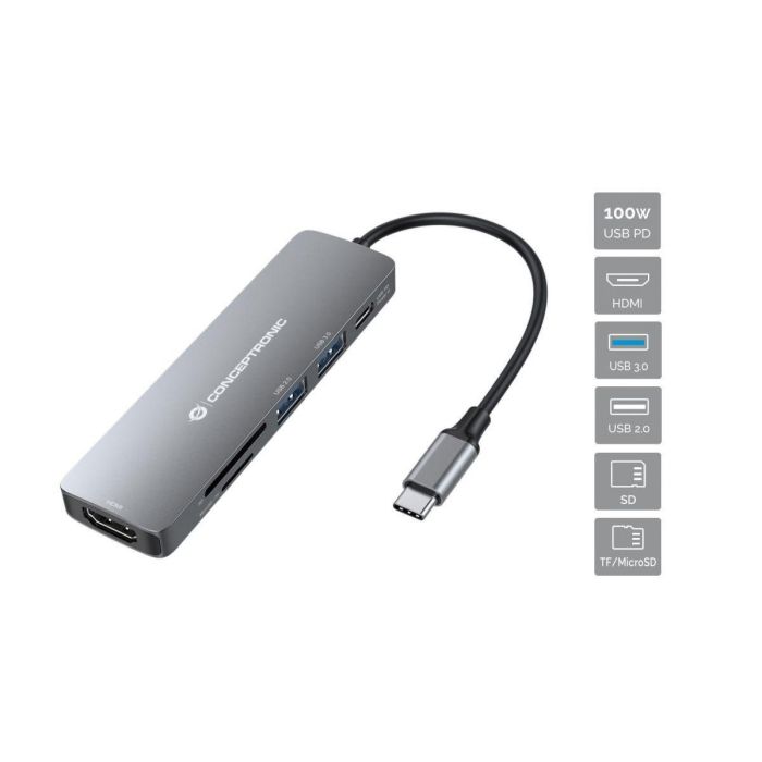 Conceptronic DONN11G Dock USB-C a HDMI, 2xUSB-A, SD, TF, Power Delivery 100W, 4K Gris